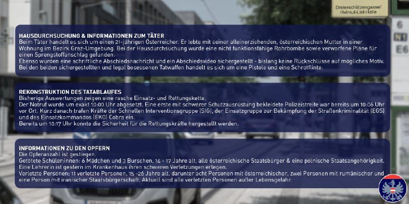 Am Wohnort des Amokläufers von Graz sind neben einer nicht funktionstüchtigen Rohrbombe auch Pläne für einen Sprengstoffanschlag gefunden worden. Diese Pläne seien offenbar verworfen worden, teilte die österreichische Polizei am Mittwoch mit. Der junge Mann lebte zusammen mit seiner Mutter, hieß es. Sein Vater lebte getrennt.